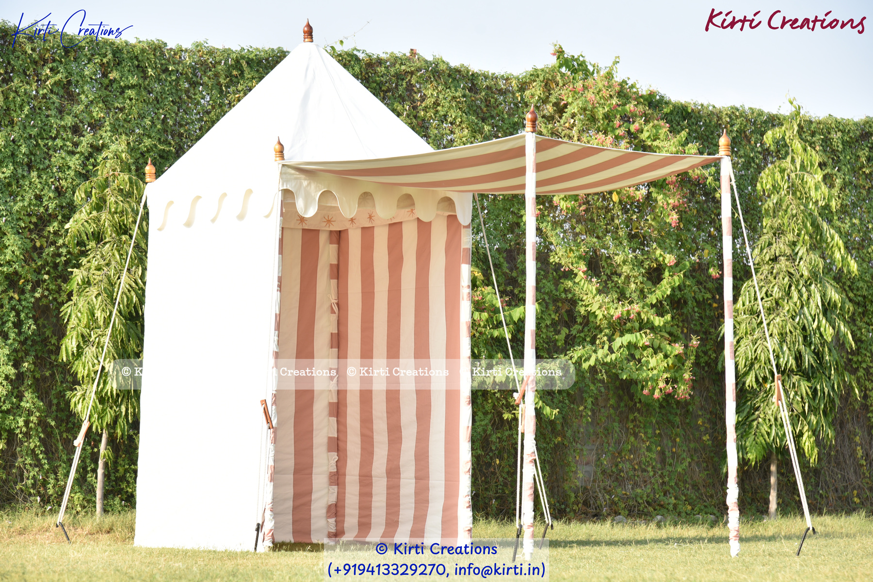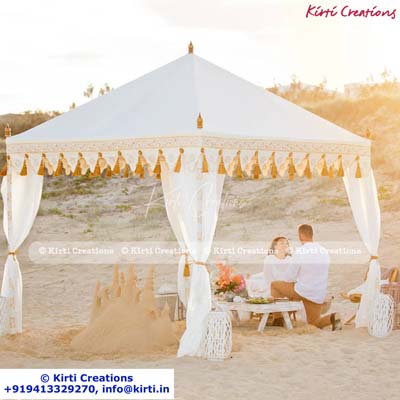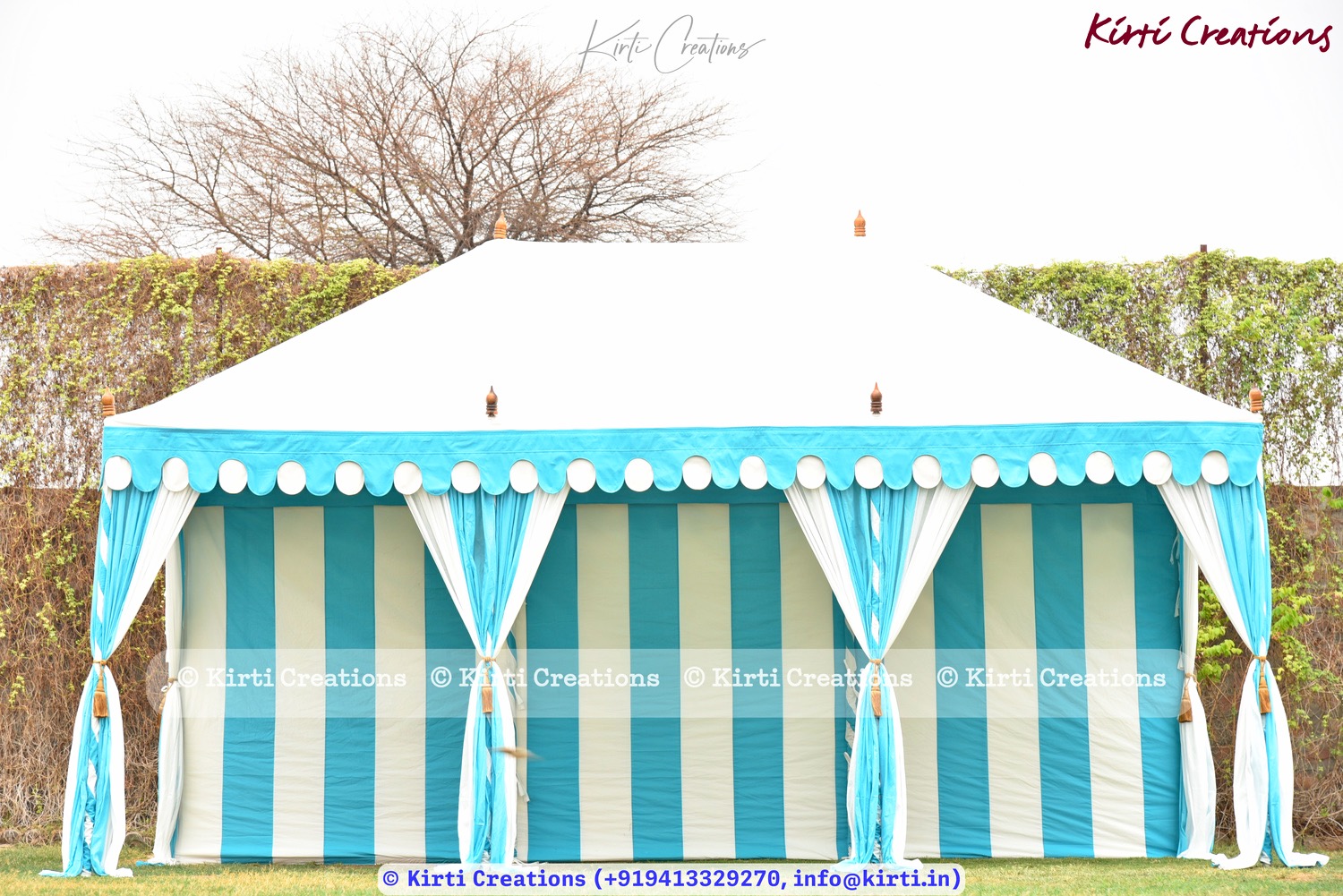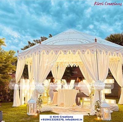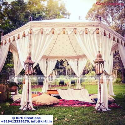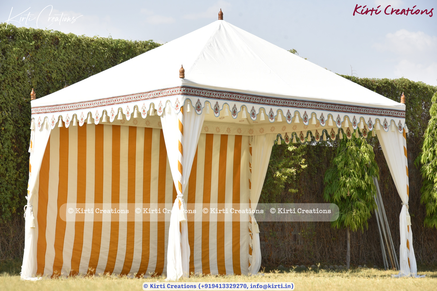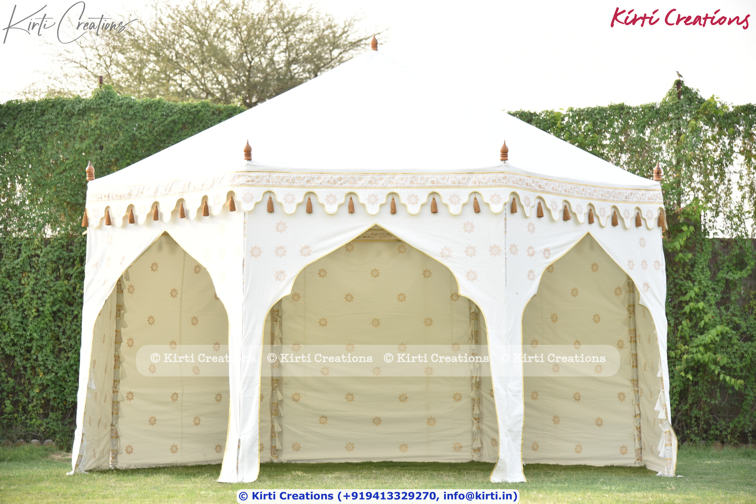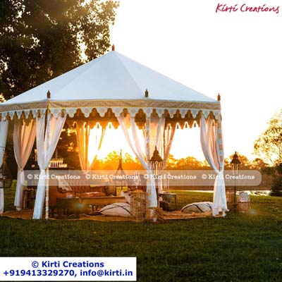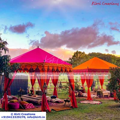 Designed mostly with pure whites and enhanced with intricate designs, Mughal Tents are running the trend for symbolising luxury and class in simplicity. We at Mughal Tents design and produce massive structures of tents that are more than enough to resonate excellence in their presence and establishments. We ensure that the colours are induced around the designs of Luxury Mughal Tents to enhance the cream-white surfaces further. The details and design of our Mughal Tents are fit to accommodate and customise our customers’ requests. Our Mughal Tents are made according to seamless measurements for pillar cloths to be attached and stand tall. All the categories of our Mughal Tents attain specific checks and measuring verifications for pillar cloths to be placed in symmetry and equal gaps. We provide all the necessary amenities with the beautiful tent and happily entertain your endless requests for customisation. We complete the structure of our Mughal Tents with royal add-ons and embellishments and present the feel of the Mughal aesthetic in simplicity. Our Luxury Tents are designed with minimal colours to glorify the charm of lights during the evening get-together and winter campfires.