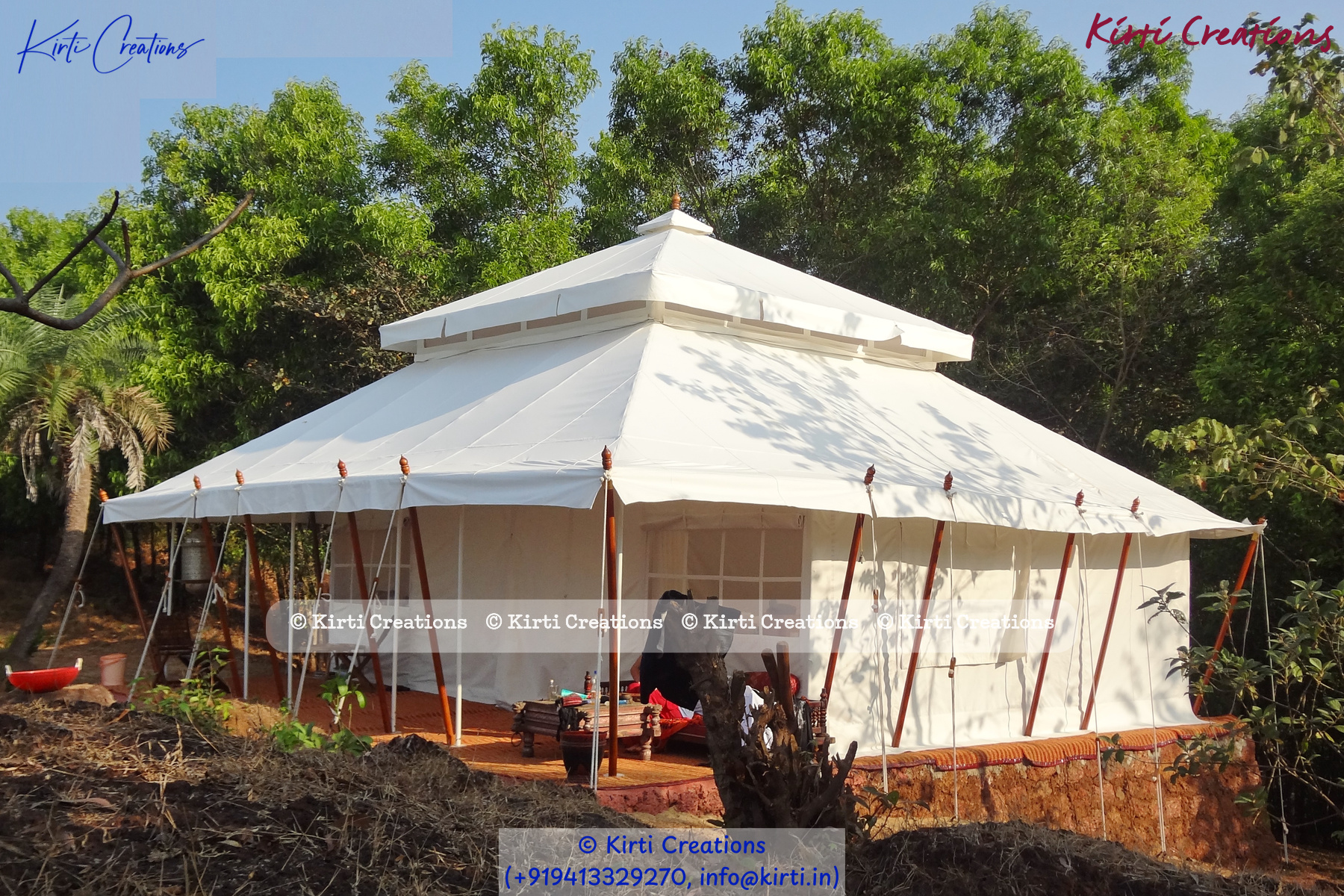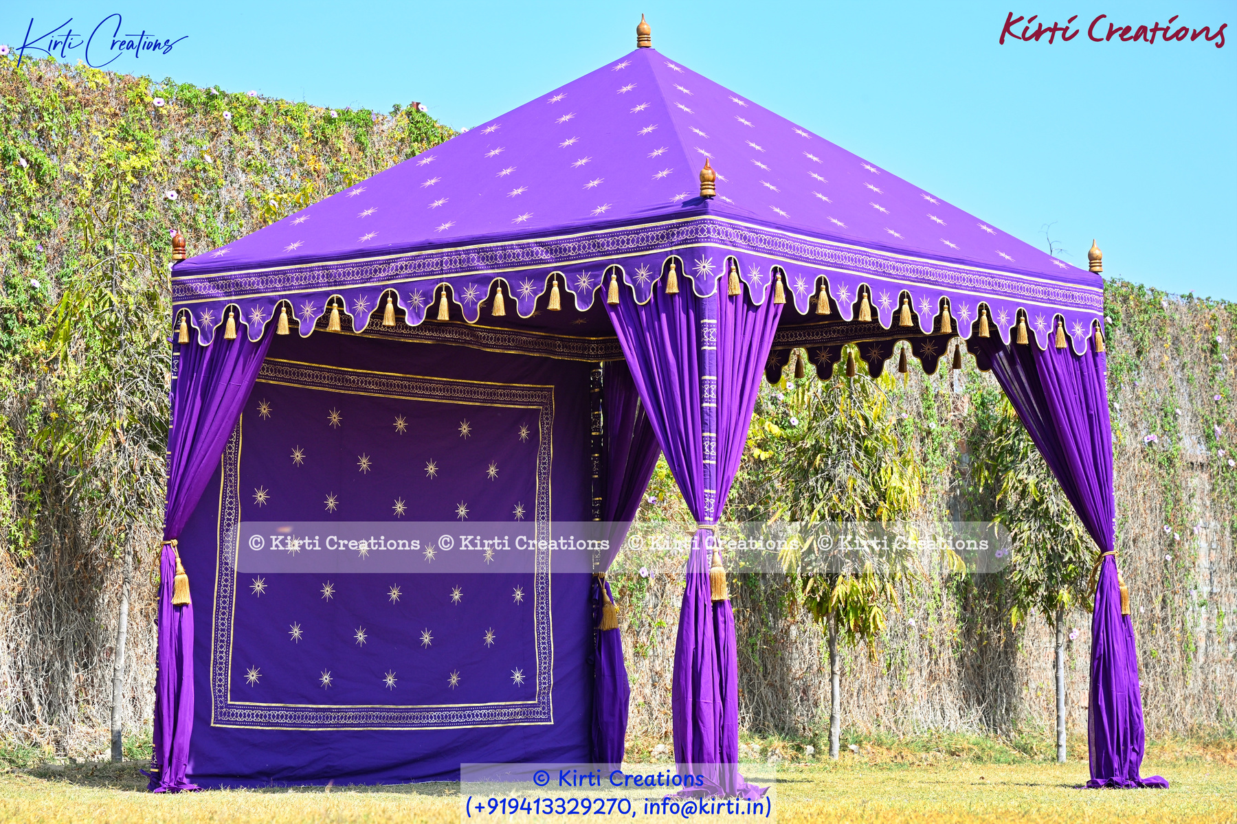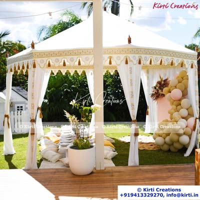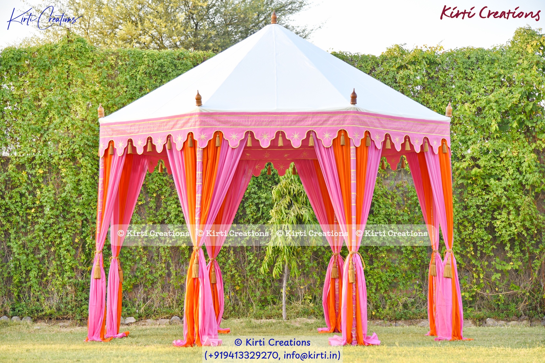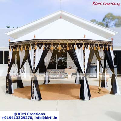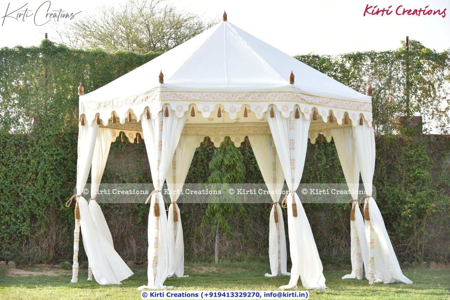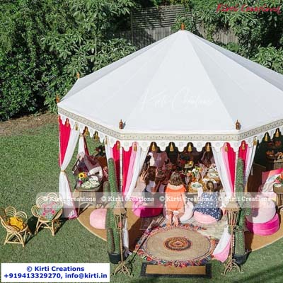 Designed mostly with pure whites and enhanced with intricate designs, Mughal Tents are running the trend for symbolising luxury and class in simplicity. We at Mughal Tents design and produce massive structures of tents that are more than enough to resonate excellence in their presence and establishments. We ensure that the colours are induced around the designs of Luxury Mughal Tents to enhance the cream-white surfaces further. The details and design of our Mughal Tents are fit to accommodate and customise our customers’ requests. Our Mughal Tents are made according to seamless measurements for pillar cloths to be attached and stand tall. All the categories of our Mughal Tents attain specific checks and measuring verifications for pillar cloths to be placed in symmetry and equal gaps. We provide all the necessary amenities with the beautiful tent and happily entertain your endless requests for customisation. We complete the structure of our Mughal Tents with royal add-ons and embellishments and present the feel of the Mughal aesthetic in simplicity. Our Luxury Tents are designed with minimal colours to glorify the charm of lights during the evening get-together and winter campfires.